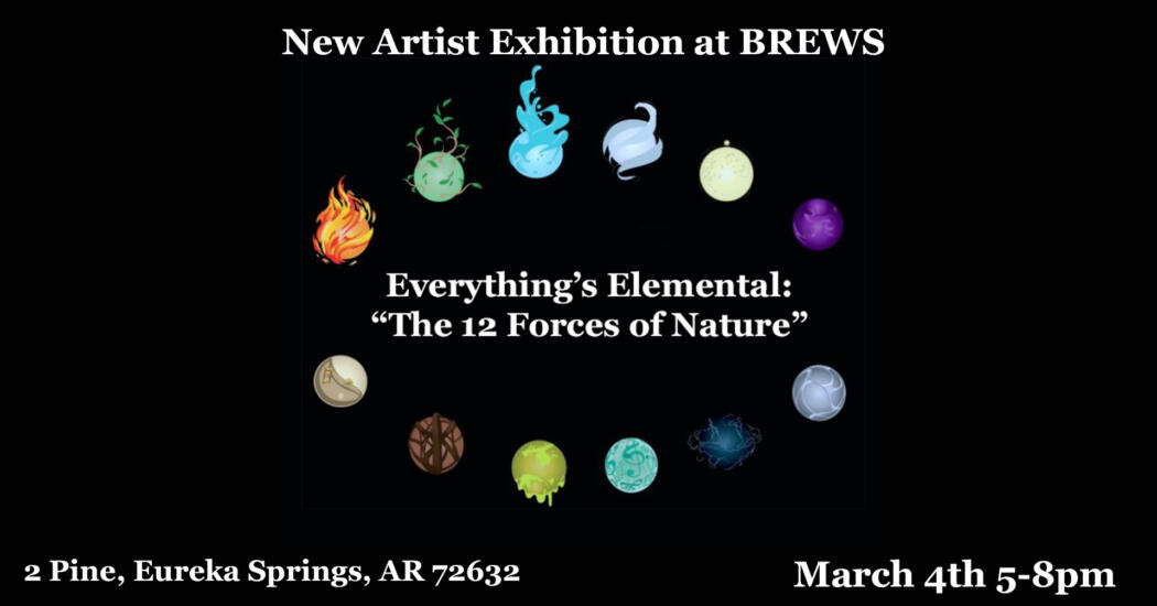 You are invited to BREWS newest art exhibition, Everything’s Elemental: “The 12 Forces of Nature,” which will open with an artist’s reception on Wednesday, March 4th, from 5 to 8 p.m.
